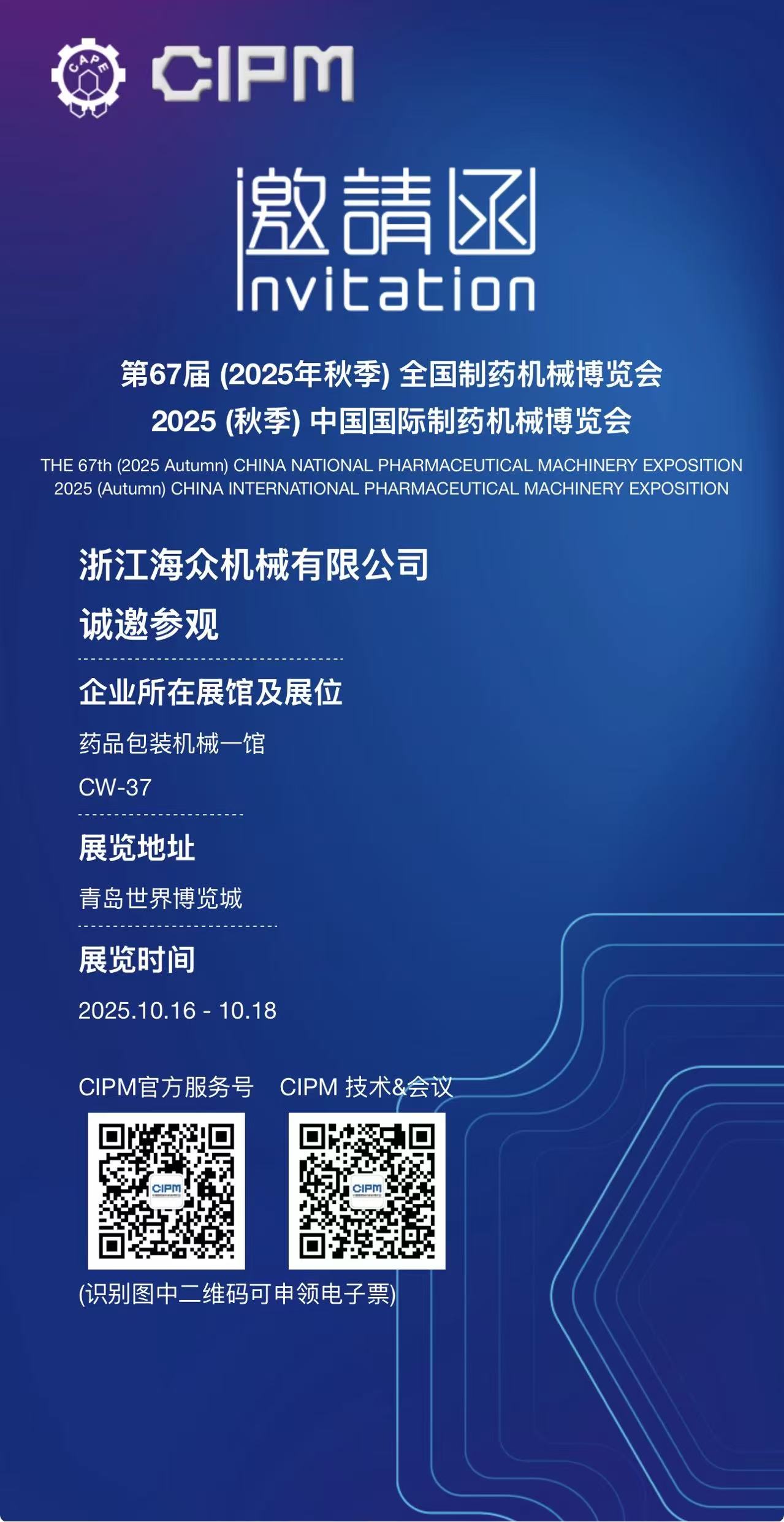您好!我司于2025年10月16-18日,参加在青岛世界博览城举行的2025(秋季)中国国际制药机械博览会,将展出药品包装全自动生产线,并为您提供专属解决方案。 我们诚挚邀请阁下届时拨冗莅临现场参观、考察、指导,采购。对此,我们深感感谢!